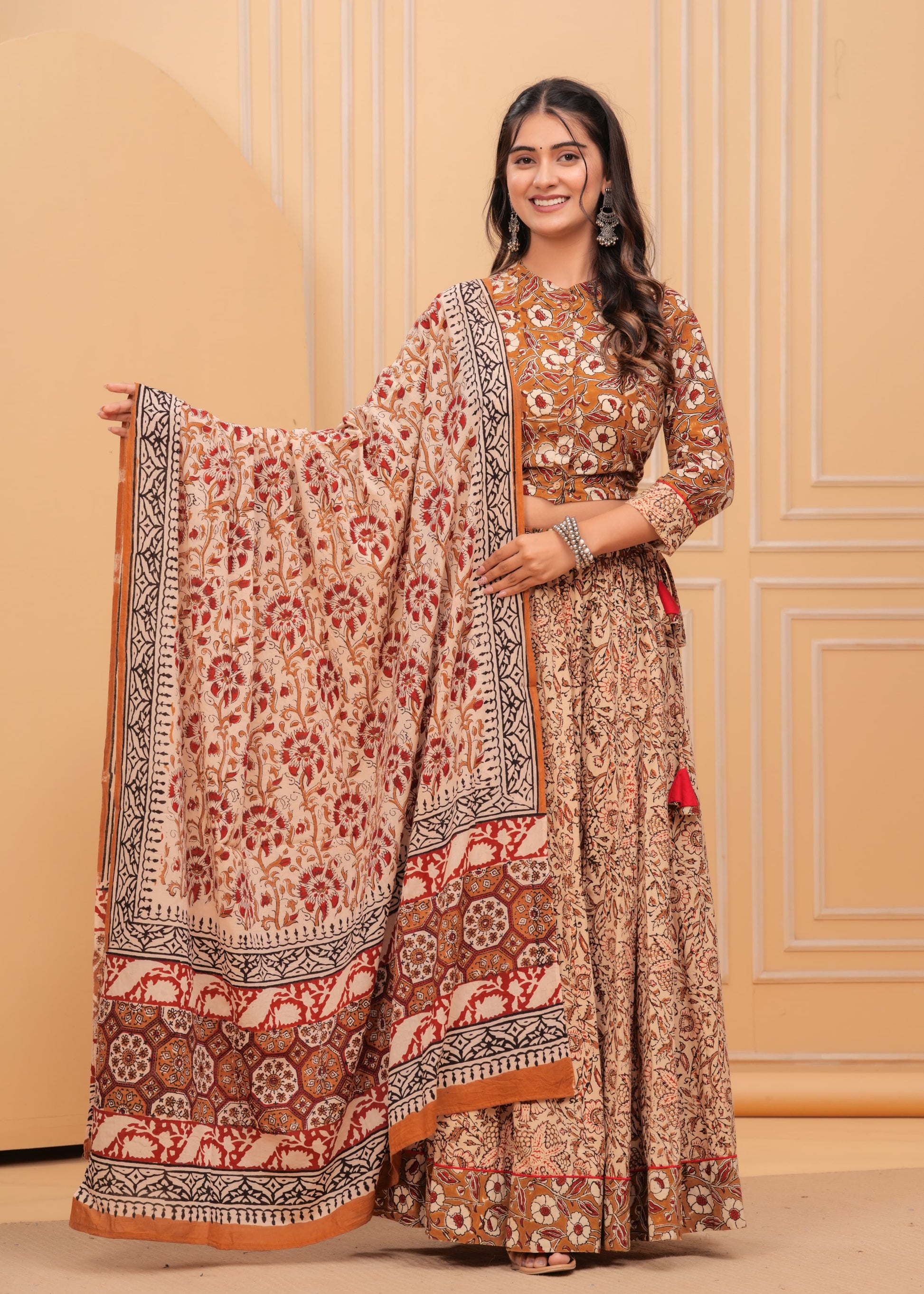 Celebrate this Navratri with our exclusive cotton hand block printed and patchwork lehenga choli set. Crafted with love in vibrant festive colours, this collection brings together tradition and style for the perfect festive look.
