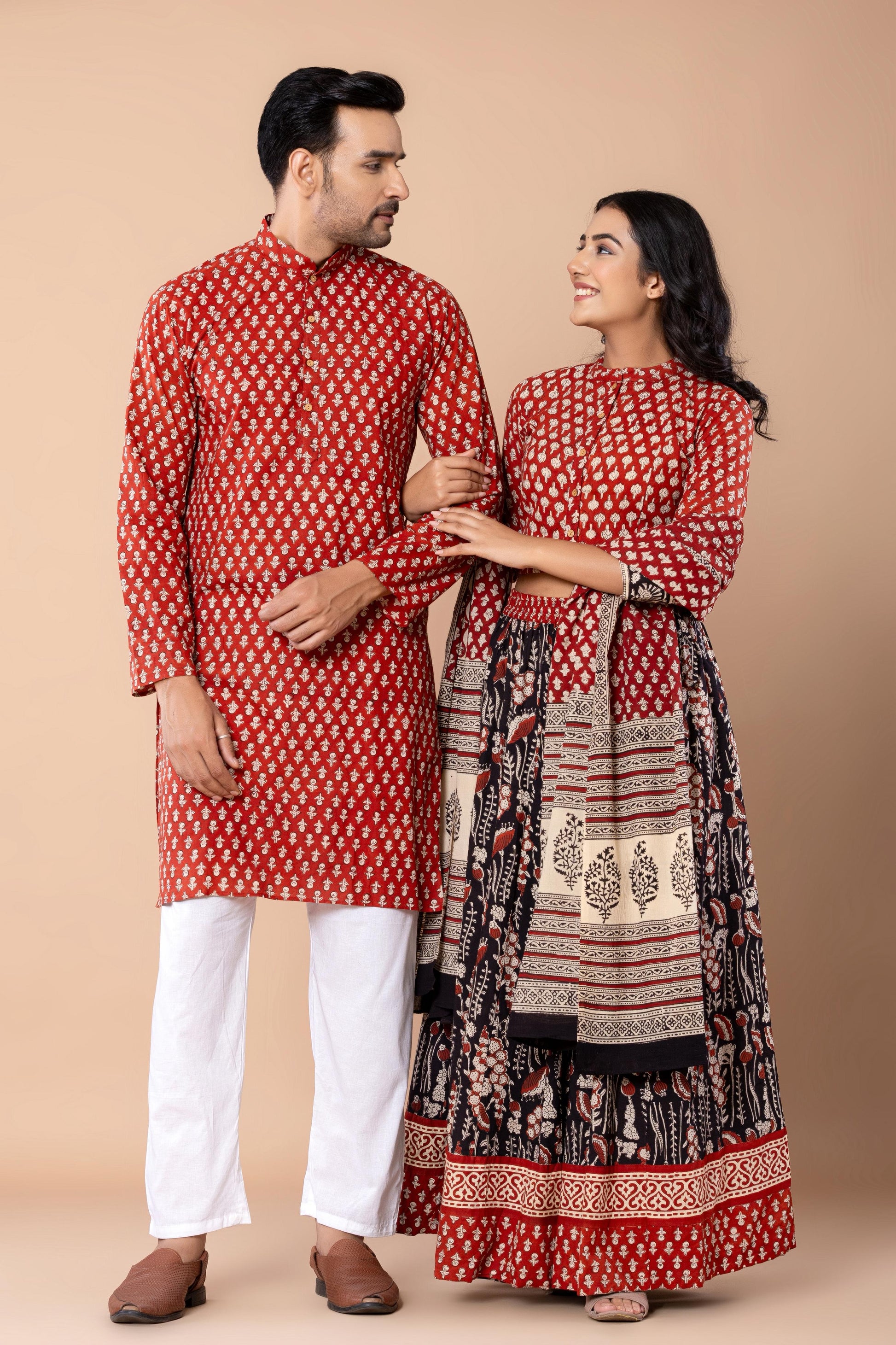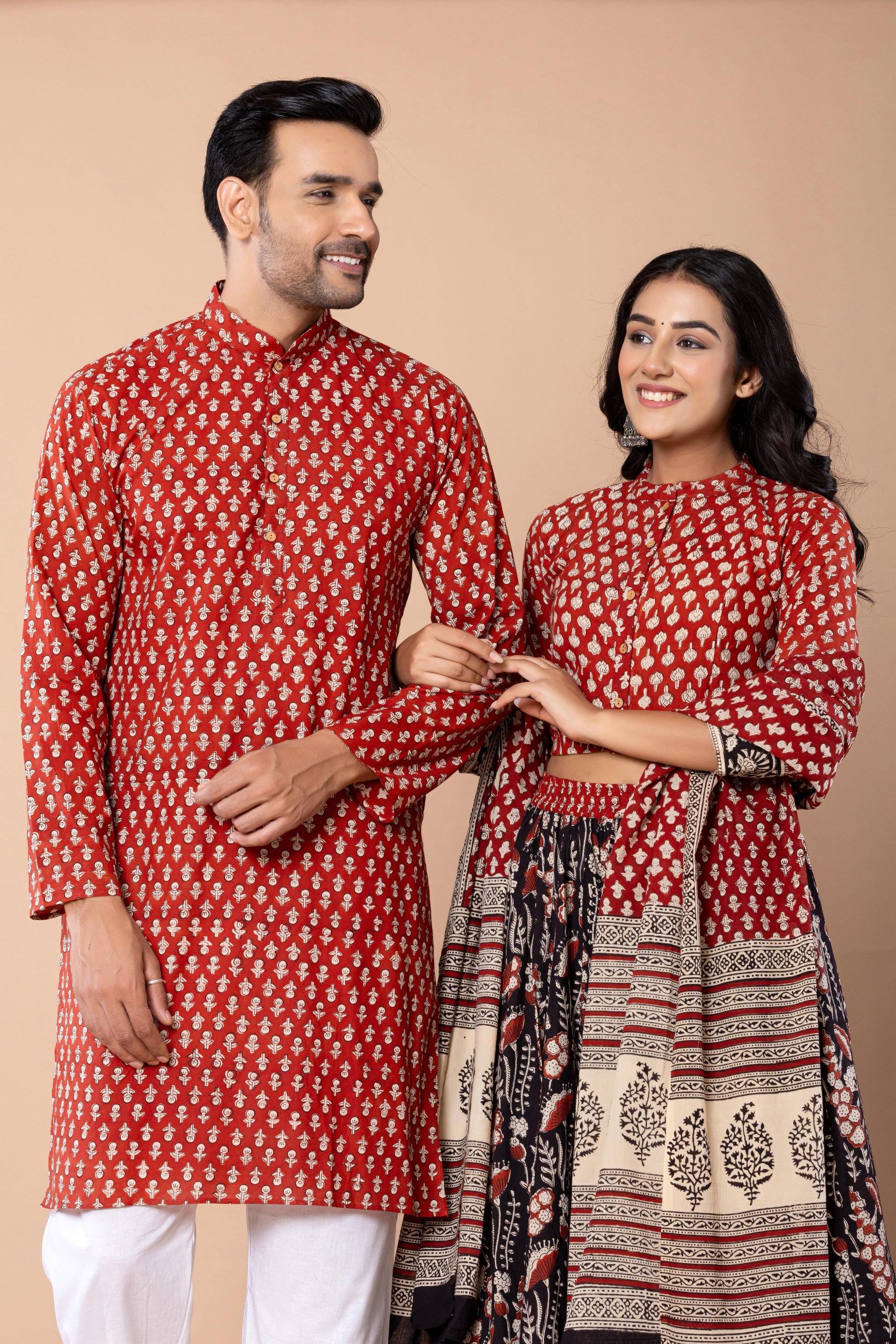 Celebrate love, tradition, and timeless craft with our beautifully coordinated couple dress set. Handcrafted using pure cotton and adorned with classic Bagru hand block prints, this set is perfect for festive days, cultural events, and pre-wedding moments.