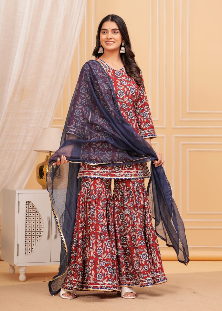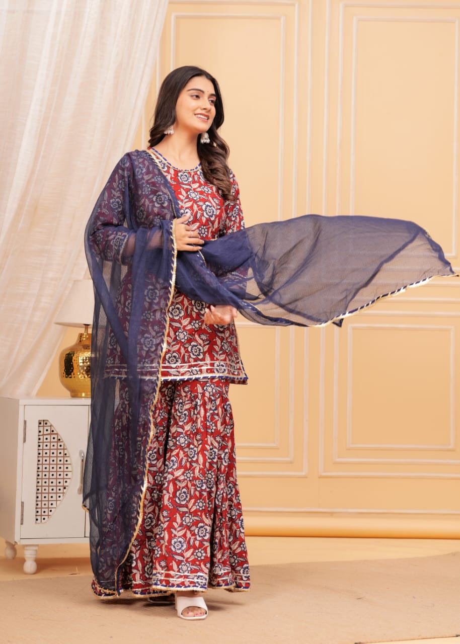 Fabric: Pure cotton 60×60 for top and gharara, lightweight Kota doria for dupatta