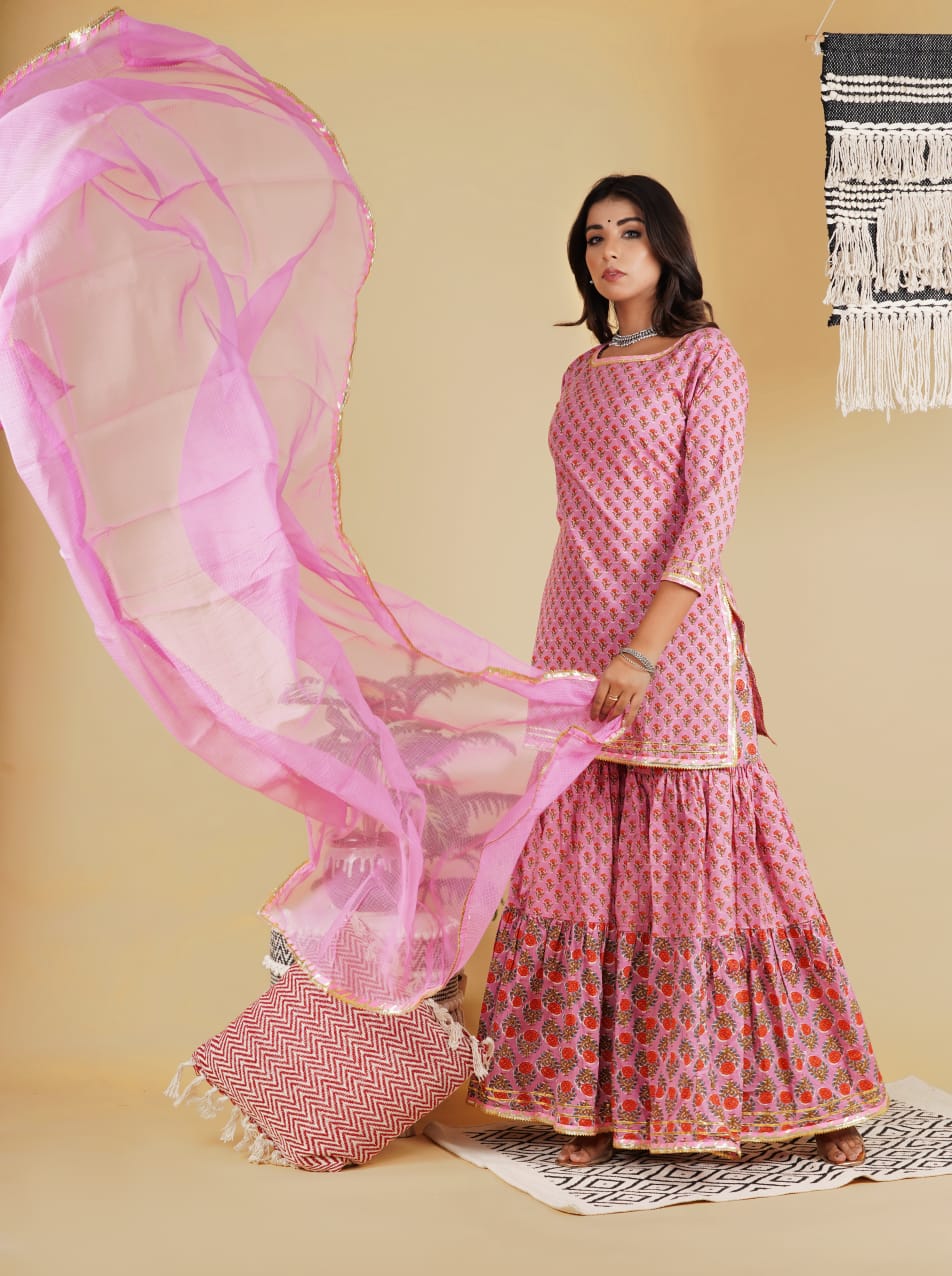 Fabric: Pure cotton 60×60 for top and gharara, lightweight Kota doria for dupatta
