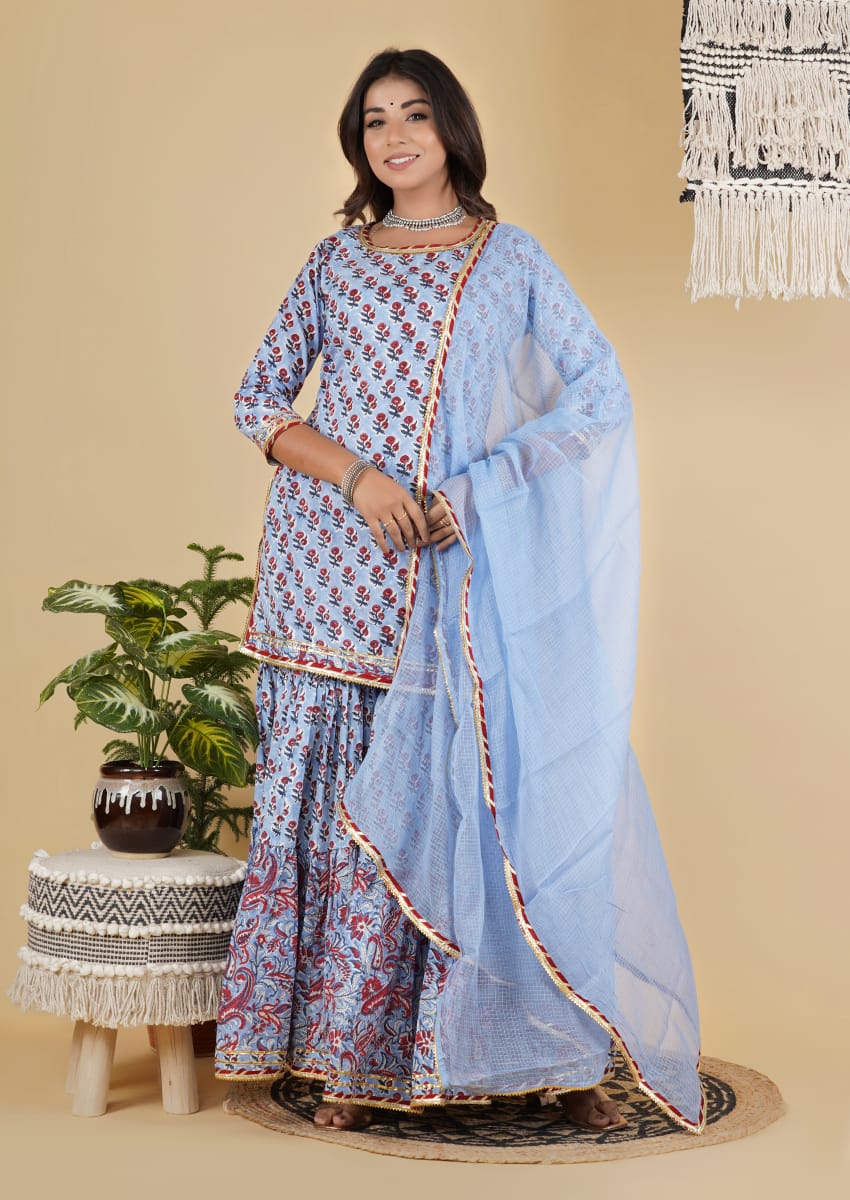 Fabric: Pure cotton 60×60 for top and gharara, lightweight Kota doria for dupatta